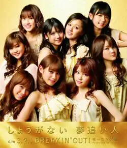 "Shōganai Yume Oibito" (しょうがない 夢追い人; "Helpless Dream Chaser") is the 39th single release by the J-pop group Morning Musume. It was released under the Zetima label on May 13, 2009. The CD was released in one regular and two limited editions, Limited A and Limited B, on the same day.[1] The single ranked #1 on Oricon's weekly chart, making it their first #1 since their single "Aruiteru", released in late 2006,[2] and the first #1 Morning Musume single featuring 8th generation members Aika Mitsui, Junjun, and Linlin.[3] The Single V version of the single was released on May 20, 2009.[4]