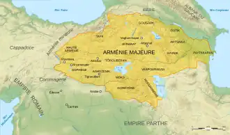 The Sassanid invasion of Armenia in 350 AD was led by Sassanid Shahanshah Shapur II (r. 309–379) against the joint Roman-Armenian army commanded by Emperor Constantius II (r. 337–361). It ended in a decisive victory for the allies, with Shapur barely escaping from his camp in Satala after a pitched battle.[2] He lost much spoil in the sacking of his camp, and the victors forced him to recognize the succession in the Kingdom of Armenia of Arshak II (r. 350–368), son of Tiran (r. 339–350),[6] who had been blinded and taken to Ctesiphon,[1][7] capital of the Sasanian Empire in Asoristan, some time earlier in the same year.
