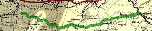 The first South Pennsylvania Railroad was originally chartered as the Duncannon, Landisburg, and Broad Top Railroad Company on May 5, 1854.[1] Its intended route began in Duncannon, passed through Landisburg and Burnt Cabins and ended on the Juniata River via the Broad Top Mountain coalfields. On May 5, 1855, it was renamed the Sherman's Valley and Broad Top Railroad Company, and the planned eastern terminus was changed from Duncannon to the mouth of Fishing Creek, in Perry County near Marysville, in order to connect with the Pennsylvania Railroad.[1] Another amendment to the charter on May 12, 1857, allowed it to connect with the Allegheny Portage Railroad and the Pittsburgh and Connellsville Railroad.[1] Around this time, two miles of the proposed route were in fact graded. On March 31, 1859, it was given the grandiose name of Pennsylvania Pacific Railway Company, with the rights to extend into Maryland and Virginia.[1] On April 1, 1863, it was renamed as the South Pennsylvania Railroad Company.[1] Despite feverish promotion, including plans for 200 miles (322 km) of line from Marysville to West Newton (on the Youghiogheny River), no further work was completed. The two miles (3 km) of grading were sold off in 1872 and the charter became dormant on May 31, 1879.