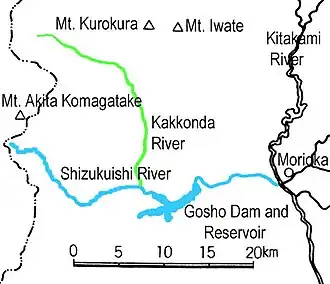 The Shizukuishi River rises in the Ōu Mountains just south of Mount Akita-Komagatake in the town of Shizukuishi and empties into the Kitakami River in the city of Morioka. The Gosho Dam is situated on the Shizukuishi River in western Morioka. This dam was completed in 1981. The entire length of the river is home to many renowned hot springs.