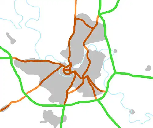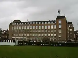The town suffered very little from air raids in the Second World War; the worst case was in 1940, when a woman and her two grandchildren were killed when a cottage was destroyed on Ellesmere Road, the only local air raid deaths.[104] Therefore, many of its ancient buildings remain intact and there was little redevelopment in the 1960s and 1970s. However, some historic buildings were demolished to make way for the brutalist architectural style of the 1960s, though the town was saved from a new inner ring road due to its challenging geography.[105] A notable example of 1960s/70s construction in Shrewsbury was Telecom House on Smithfield Road, demolished in the 2000s.[106]