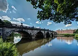 From the late 1990s, the town experienced severe flooding problems from the Severn and Rea Brook. In the autumn of 2000 large swathes of the town were underwater, notably Frankwell, which flooded three times in six weeks.[111] The Frankwell flood defences were completed in 2003, along with the new offices of Shrewsbury and Atcham Borough Council. More recently, such as in 2005 and 2007 but not 2020, flooding has been less severe and the defences have generally held back floodwaters from the town centre areas. However, the town car parks are often left to be flooded in the winter, which reduces trade in the town, most evidenced in the run up to Christmas in 2007.[112]