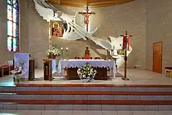 The Shrine has a replica of the icon of Black Madonna of Częstochowa of which the Order of Saint Paul the First Hermit have been custodians since 1382. This replica was brought to Australia by Fr. Augustine Lazur after Pope John Paul II blessed it on the 20th of June 1983, during his pilgrimage to Jasna Góra.[5] The Icon was first enshrined in the church at Berrima on the 13th of May 1984 before it would be moved to its permanent home at the then soon to be founded Monastery.[6] This icon was crowned in 2001 with crowns that had been blessed by Pope John Paul II.[7]