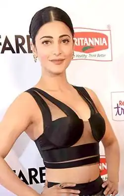 In 2015, Haasan played the female lead in five films: Gabbar Is Back and Welcome Back in Hindi, Srimanthudu in Telugu, and Puli and Vedalam in Tamil. Except Puli, the rest of the releases achieved commercial success.[13][14][15] She earned a nomination for the Best Actress – Telugu award at the 63rd Filmfare Awards South ceremony for her performance in Srimanthudu.[16] The following year, she had two releases: Rocky Handsome and Premam. The latter, a Telugu remake of the 2015 Malayalam-language film of the same name, drew criticism for Haasan's casting before its release.[17][18] She played the role of a young college lecturer with a slightly stern approach towards her students.[19] The remake gained positive critical reception,[20] and earned average returns.[21] Her Tamil film Si3 had a theatrical release in 2017; it was a commercial success.[22] Following a career downturn and hiatus, Haasan has appeared in Krack (2021), Veera Simha Reddy (2023), Waltair Veerayya (2023) and Salaar: Part 1 – Ceasefire (2023), all of which ranks among the highest grossing Telugu films of all time.[23][24]