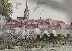The siege of Grol or Groenlo in 1595 was a siege of Groenlo by States forces under Maurice of Nassau during the Eighty Years' War in an attempt to capture it from the Spanish Empire. It lasted from 14 to 24 July 1595, ending with the arrival of a Spanish relief force under Cristóbal de Mondragón and Maurice's retreat. Two years later, in 1597, Maurice returned to carry out another siege of Groenlo. Both these sieges formed part of what would later be called the Ten Glorious Years.