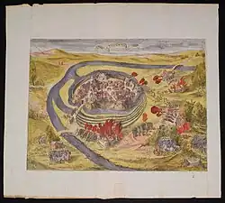 On 17 April Vieilleville's first troops arrived outside the town walls and dug siegeworks at key points, cutting off the food supply to the city. On 26 April the German troops arrived, along with the other French reinforcements sent by Imbert de Bourdillon, allowing the town to be completely surrounded. Early in May Guise sent a message demanding that the seigneur de Vieilleville await his arrival with a further 400 men at arms, 500 light cavalry and 1,000 mounted arquebusiers - he and Piero Strozzi finally arrived at the town on 28 May. This meant that the French force now totalled around 12,000 men[2]