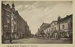 On 1 September 1939, the first day of the German invasion of Poland and World War II, there was a skirmish between German saboteurs and the Polish self-defense in the present-day district of Michałkowice.[4] German saboteurs then entered the local mine, taking several dozen Polish miners as hostages.[4] After a battle, Polish troops and volunteers, including members of the "Sokół" Polish Gymnastic Society and boy scouts, recaptured the mine.[4] There were deaths on both sides, and the Poles also captured dozens of German saboteurs.[4] The Germans eventually invaded and captured the city in the following days, and already on 8 September 1939 the German Freikorps murdered six Poles in the city.[5] In September 1939, the German Einsatzgruppe I operated in the city and committed various crimes against the Polish population.[6] During the German occupation, two forced labour camps were established and operated in the city: one for Poles (Polenlager)[7] and one for Jews.[8] In April 1944, the Germans also established a subcamp of the Auschwitz concentration camp, in which over 900 people were held and subjected to forced labour.[9] In January 1945, the prisoners of the subcamp were taken to the Mauthausen concentration camp,[9] and shortly afterwards the Germans left the city and the occupation ended.