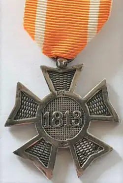 The decoration is a five-armed silver cross, 35 mm at its widest point. In the centre of the cross is a medallion inscribed with the year '1813' on the obverse and '1815' on the reverse. It was worn on the left breast from a 27.5 mm wide silk ribbon of orange with a white stripe to towards each edge.[1]