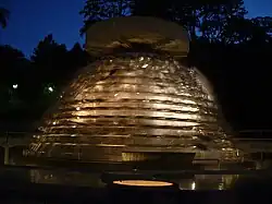 A brief history and description:The sculpture creation started in 1975 when Gabriel Martin Landrove, a USB architect student, won an institutional contest. Construction took place until July 5, 1991, when Phd Professor Stefan Zarea conducted the final works and inaugurated it.[6] The artistic concept was inspired by the morning dew condensed over a tree sleeve falling down into another one. The sleeves are represented with 576 metal trowels arranged as a 48 by12 matrix in a conical truncated structure that allows the water to create multiple small waterfalls. This huge structure can rotate over its own vertical axis and the movement is produced by a pelton wheel dispose at the lower level of the conical structure. The rise of the water to the top and its rotational momentum is produced by hydraulic force drive by an electrical pump. There is also a tree level shallow pool, a top circular viewer and an intricate circular walk sides that complements the design.