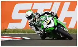 For 2009 he left Jentin to join MSS Colchester Kawasaki. Despite injuring his collarbone pre-season he qualified on the front row for round 3 at Donington Park, and took a 4th-place finish at round 4 at Thruxton. Andrews again impressed at Mallory Park, leading race one before being catapulted out by Josh Brookes in an incident which eliminated seven riders.[5] He was already riding injured at this point, and an operation on his wrist immediately after this round caused him to miss the 3-race meeting at Brands Hatch[6] He took his first career podium at Cadwell Park, finishing 4th on the road but being promoted when on-the-road winner Leon Camier was excluded for ignoring a black and orange flag.[7] In race one at the same venue he touched with team-mate Julien da Costa in race one, finishing fifth ahead of the Frenchman.[8] He was successful at Croft despite using no rider aids. He also contested the World Superbike round at Donington, finishing 10th in race 2 after passing the leading works Kawasaki of Broc Parkes. He finished the year by finishing 7th on his debut in the Macau street race.[9] Andrews re-signed for the MSS Colchester Kawasaki team for 2009 alongside Gary Mason.