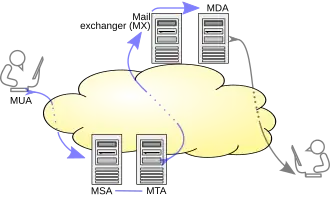 The initiating host, the SMTP client, can be either an end-user's email client, functionally identified as a mail user agent (MUA), or a relay server's mail transfer agent (MTA), that is an SMTP server acting as an SMTP client, in the relevant session, in order to relay mail. Fully capable SMTP servers maintain queues of messages for retrying message transmissions that resulted in transient failures.