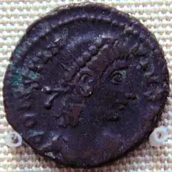 Bronze coin of Constantius II (337–361 AD), found in Karghalik, modern China