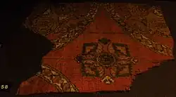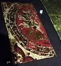 The Sampul tapestry, a woollen wall hanging from Lop County, Hotan Prefecture, Xinjiang, China, showing a possibly Greek soldier from the Greco-Bactrian kingdom (250–125 BC), with blue eyes, wielding a spear, and wearing what appears to be a diadem headband; depicted above him is a centaur, from Greek mythology, a common motif in Hellenistic art;[46] Xinjiang Region Museum.