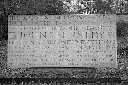 JFK Memorial stone at Runnymede, Surrey. Garden designed by Jellicoe and dedicated in 1965.