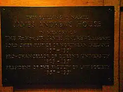 Plaque sited in the Queen's University of Belfast School of Law. It reads; "This building is named James Andrews House in memory of the Rt. Hon. Sir James Andrews, Baronet, Lord Chief Justice of Northern Ireland 1937–1951, Pro-Chancellor of Queen's University 1929–1951, President of the Faculty of Law Society 1937-1951" | |