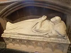Glynne collapsed and died outside Bishopsgate railway station, London, on 17 June 1874 after visiting churches in Essex and Suffolk.[25][26] He was buried in St Deiniol's Church, Hawarden, where he is commemorated by a recumbent effigy by Matthew Noble in a tomb recess designed by John Douglas.