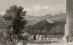 As the largest landowner in North Wales, and controller of many parliamentary seats, he was referred to, at least by himself, as the 'Prince in Wales'.[8] and had a keen interest in military affairs. In 1794 he raised a regiment of fencible cavalry called the "Ancient British Fencibles" and took part in the suppression of the Irish rebellion of 1798, when they were known as "Sir Watkin's lambs" and "a terror of the rebels", acquiring a reputation that he had to defend from charges of cruelty among the Irish. He commanded them until they disbanded in 1800, after Williams-Wynn unsuccessfully requested they be deployed on foreign service.[2][9] Colonel of the Royal Denbigh Rifles since 1797, he deployed with a militia battalion (3rd Provisional Battalion) largely composed of his own men, to serve under his kinsman the Marquess of Buckingham in France from March to June 1814. Originally intending to link up with the Duke of Wellington's army who had come from Spain before the French armistice intervened, they were garrisoned in Bordeaux where he was known among local people as "le gros commandant Whof Whof Whof". He also became Colonel commanding the Denbighshire Yeomanry Cavalry in 1820 and was Welsh Militia aide-de-camp to King William IV from 1830 to 1837 and to Queen Victoria from 1837 until his death.[2]