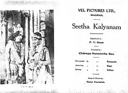 Sita Kalyanam is a 1934 Telugu-language Hindu mythological film directed by Chitrapu Narasimha Rao and produced by Pinapala Venkata Dasu (P. V. Dasu) under the banner of Vel Pictures.[1] The film stars Bezawada Rajaratnam, Master Kalyani, and Madhavapeddi Venkatramayya, with music composed by Gali Penchala Narasimha Rao.[2] Released on 6 October 1934, it was a commercial success.[3]