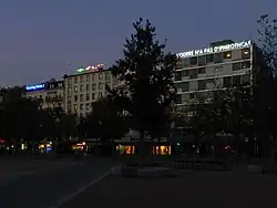 In Geneva, Switzerland, the Contemporary Art Funds are looking for original ways to integrate art into architecture and the public space since 1980.[18] The Neon Parallax project, initiated in 2004, is conceived specifically for the Plaine de Plainpalais, a public square of 95'000 square meters, in the heart of the city. The concept consists of commissioning luminous artistic works for the rooftops of the buildings bordering the plaza, in the same way, advertisements are installed on the city's glamorous lakefront. The 14 artists invited had to respect the same legal sizes of luminous advertisements in Geneva. The project thus creates a parallax both between locations, and messages, but also by the way one interprets neon signs in the public realm.[19]