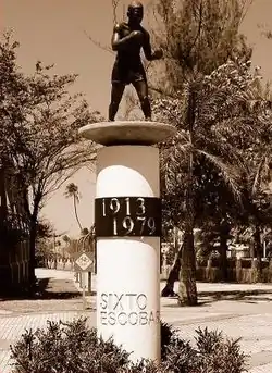 After his death, the town of Barceloneta honored his memory by a statue. His remains are interred at Cementerio Municipal Viejo in Barceloneta, Puerto Rico, according to a memorial written to honor his life. Escobar became the first world boxing champion in history to have a statue in his honor.[12] On June 9, 2002, Escobar was inducted into the International Boxing Hall of Fame.[13] He became the fourth Puerto Rican to receive this distinction and the first to be included in the "Old Timers" section.[12] In March 2005, a second statue of Estobar was unveiled at the Estadio Sixto Escobar in San Juan.[12] Among the celebrities that attended the ceremony were former boxing world champions Julian Solís and Alfredo Escalera. This statue's location served as a remembrance tribute during the 94th anniversary of Escobar's birth, when a flower crown was placed at its feet.[14] During this date, an activity was presented by Puerto Rico's House of Boxing in the library of the Pabellón de la Fama del Deporte Puertorriqueño.[14] Among those who attended the ceremony were Solís, Escalera and Iván Calderón.[14] On this date, People Inc. presented a documentary covering his life, which was donated to the venue.[14] Several buildings and streets were named after Escobar posthumously, including the Auditorio Sixto Escobar. The house where he lived was later turned into a library and museum bearing his name.[10]
