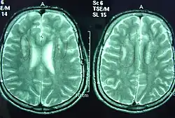 T2-weighted MRI images of a 25-year-old male with Sjögren–Larsson syndrome revealing dysmyelination in the deep periventricular white matter and reduced brain volume in the frontal lobe