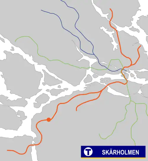 Skärholmen metro station is a station on the red line of the Stockholm metro, located in the district of Skärholmen. The station was opened on 1 March 1967 as the south terminus of an extension from Sätra.[2] The distance to Slussen is 11.7 km (7.3 mi).