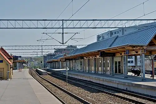 Skøyen Station (Norwegian: Skøyen stasjon) is a railway station located at Skøyen in Oslo, Norway. It is situated on the Drammen Line, 4.36 kilometers (2.71 mi) from Oslo Central Station. It is served by regional trains and the Oslo Commuter Rail, operated by Vy, as well as by the Airport Express Train. The station is elevated and has two island platforms and four tracks.