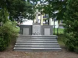 During World War II, from 1939 to 1945 it was occupied and annexed by Germany and was administered as part of the Berent district in Reichsgau Danzig-West Prussia. Hundreds of Poles from Skarszewy and surrounding villages were imprisoned in the town, and later massacred in various places during the Intelligenzaktion in October and November 1939. Over 240 Poles, previously imprisoned in Skarszewy, including teachers, merchants, local officials, priests, activists, craftsmen, workers, farmers, were murdered in the nearby forest by the SS, Gestapo and Selbstschutz.[8] Over 100 Poles were murdered in the forest between Skarszewy and Więckowy.[8] The wójt of Gmina Skarszewy, Emil Więcki, was murdered in a massacre carried out in Mestwinowo.[9] The local school principal was among Polish teachers and principals murdered in the Dachau concentration camp.[10] In November 1939, around 1,000 Poles, mostly families of those murdered in the massacres, were expelled to the General Government in the more-eastern part of German-occupied Poland.[11]