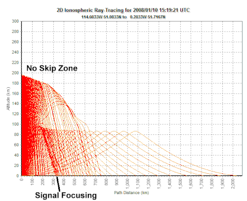 When using medium to high-frequency radio telecommunication, there are radio waves which travel both parallel to the ground, and towards the ionosphere, referred to as a ground wave and sky wave, respectively. A skip zone is an annular region between the farthest points at which the ground wave can be received and the nearest point at which the refracted sky waves can be received. Within this region, no signal can be received because, due to the conditions of the local ionosphere, the relevant sky waves are not reflected but penetrate the ionosphere.