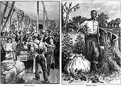 Slavery in the United States was a variable thing, in "constant flux, driven by the violent pursuit of ever-larger profits."[65] The enslaved labor force of the United States, while stereotypically drawn as field labor for the production of cash crops like sugar and cotton, performed nearly every type of skilled labor sought by the economy. An examination of 1200 runaway slave ads published in Tennessee found 25 blacksmiths, 18 carpenters, and 13 shoemakers, as well as barbers, boat builders, bricklayers, a "conjurer or fortune teller," cooks, coopers, cotton mill engineers, dressmakers (often called mantuamakers), hack drivers, iron furnace engineers, milliners, millwrights, ministers, musicians (most commonly of the fiddle/violin), a racehorse trainer, ostlers, plasterers, painters, seamstresses, stonemasons, tanners, a "turner and tin-plate workman," wagoners, waiters, and weavers.[66] Complex as it was, historians do know, however, that slavery in the United States was not a "deferred-compensation trade school opportunity."[67] Harriet Beecher Stowe summarized slavery in the United States in 1853:[68]