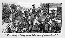 One of the many defenses of American slavery was that the imagined "benevolent paternalism" of planters was beneficial or necessary[69][70][71] (Detail, Anti-Slavery Almanac, 1840)