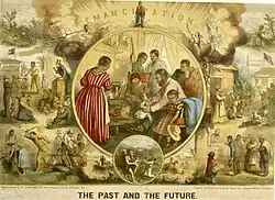 Whipping a slave, wood-engraving made 1834; Wilson Chinn, showing a slave collar and facial branding of the initials of his enslaver, Valsin B. Marmillion; slavery survivor Adam Crosswhite photographed 1878; Franklin & Armfield's slave jail in the District of Columbia, 1836; freedmen leaving South Carolina on the USS Vermont in 1862; Delia Garlic at age 100; 1818 Kentucky slave trader's ad; daguerreotype made at the 1850 Fugitive Slave Convention; White Gold in the Delta, painted 1939 by Beulah Bettersworth for the Indianola, Mississippi post office, mural destroyed 1960s