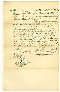 In early 1775, the royal governor of Virginia, Lord Dunmore, wrote to the Earl of Dartmouth of his intention to free slaves owned by American Patriots in case they staged a rebellion.[37][38] On November 7, 1775, Dunmore issued Dunmore's Proclamation, which promised freedom to any slaves of American patriots who would leave their masters and join the British forces.[39] Historians agree that the proclamation was chiefly designed for practical rather than moral reasons, and slaves owned by American Loyalists were unaffected by the proclamation. About 1,500 slaves owned by patriots escaped and joined Dunmore's forces. A total of 18 slaves fled George Washington's plantation, one of whom, Harry, served in Dunmore's all-black loyalist regiment called "the Black Pioneers".[40] Escapees who joined Dunmore had "Liberty to Slaves" stitched on to their clothes.[41] Most died of disease before they could do any fighting, but three hundred of these freed slaves made it to freedom in Britain.[42] Historian Jill Lepore writes that "between eighty and a hundred thousand (nearly one in five black slaves) left their homes ... betting on British victory", but Cassandra Pybus states that between 20,000 and 30,000 is a more realistic number of slaves who defected to the British side during the war.[40]