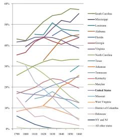 The South developed an agricultural economy dependent on commodity crops. Its planters rapidly acquired a significantly higher number and proportion of enslaved people in the population overall, as its commodity crops were labor-intensive.[14] Early on, enslaved people in the South worked primarily on farms and plantations growing indigo, rice and tobacco (cotton did not become a major crop until after the 1790s). In 1720, about 65 percent of South Carolina's population was enslaved.[15] Planters (defined by historians in the Upper South as those who held 20 or more slaves) used enslaved workers to cultivate commodity crops. They also worked in the artisanal trades on large plantations and in many Southern port cities. The later wave of settlers in the 18th century who settled along the Appalachian Mountains and backcountry were backwoods subsistence farmers, and they seldom held enslaved people.