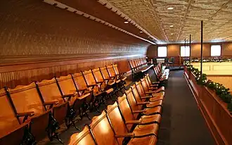 Many small-town opera houses constructed during the 18th and early 19th centuries consisted of a stage with adjoining dressing rooms located on an upper floor of a multi-story building, with lower levels occupied by retail space or the meeting rooms of fraternal associations.[6][7] In the Great Plains, opera houses generally had a seating capacity ranging from 200 to 1600.[8]