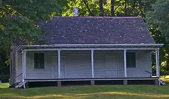 A porch runs the length of the south-facing front facade. The entrances are on either end, with an accompanying window, reflecting a contemporary Quaker practice of holding separate meetings for men and women. There are two other windows on the east and west elevations. A small privy is attached to the rear elevation.[1]