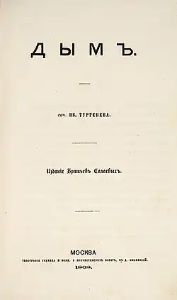 Smoke (Russian: «Дым») is an 1867 novel by the Russian writer Ivan Turgenev (1818–1883) that tells the story of a love affair between a young Russian man and a young married Russian woman while also delivering the author's criticism of Russia and Russians of the period. The story takes place largely in the German resort town of Baden-Baden.