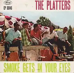 "Smoke Gets in Your Eyes" was recorded in 1958 by the Platters for their album Remember When? The group's version became a number 1 hit in the U.S. on the Billboard Hot 100 music chart, and was their highest hit on that chart. In 1959 it peaked at number 3 on the Rhythm and Blues chart.[14] The song spent 20 weeks on the UK charts, peaking at Number 1 for one week on March 20 of that same year.[15] Buck Ram, the producer, said that Harbach praised them "for reviving his song with taste."[13] The widow of composer Jerome Kern disliked the recording so much, she began legal action to prevent its distribution.[16] However, after she was informed that the record was a huge seller and she was going to receive large royalties from its sales, she dropped her lawsuit.[3][17]