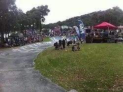 The run is made from concrete and is 140 metres (459 ft) in length running downhill.[4] The track is curved downward and lipped with a wall on first turn with lower rises on the next two turns and finishing with a drained bowl at the end.