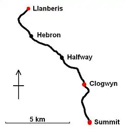 Halfway 53°05′44″N 4°05′46″W / 53.0956°N 4.0960°W / 53.0956; -4.0960 1,641 ft (500 m) As the name suggests, halfway along the line and close to the 'Halfway House' on the nearby footpath. A short distance above the station is a path that leads down to the Halfway House cafe.
