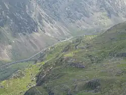 Clogwyn 53°05′03″N 4°04′49″W / 53.0841°N 4.0803°W / 53.0841; -4.0803 2,556 ft (779 m) Located on the exposed ridge and overlooks the Llanberis Pass and the Clogwyn Du'r Arddu cliffs, a popular climbing spot.