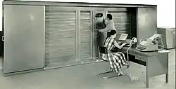 In collaboration with Crédit Lyonnais, the prototype named CABAN (Banking Calculator) was developed, placing emphasis on magnetic tape storage, offering higher capacity compared to punched cards. Intending to compete with the IBM 1401 and the Bull Gamma 30, the CAB 3900 was a fully transistorized machine, featuring a magnetic-core main memory and accommodating up to nine tape drives.[12] It operated at a fairly fast 2 MHz (in contrast, the IBM 1401 was clocked at 870 kHz), which enabled SEA to devise a bit-serial processor, which was less complex and costly while maintaining adequate performance for business applications. The Symmag logic, however, was abandoned as it was deemed too slow.[13]