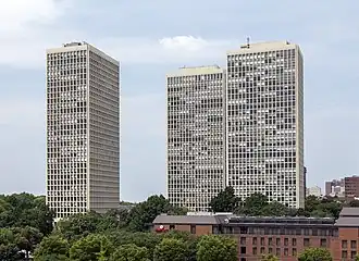 The Society Hill Towers are a three-building condominium complex located in the Society Hill neighborhood of Philadelphia, Pennsylvania. The complex contains three 31-story skyscrapers with 624 units on a 5-acre (2.0 ha) site.[1] The towers were designed by I. M. Pei and Associates and are constructed of cast-in-place concrete, with each apartment featuring floor-to-ceiling windows.[2] Completed in 1964, the apartments were originally rental units but were converted to condominiums in 1979.[1]