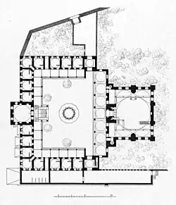 The mosque is noted for its architecturally challenging location on a steep slope. Sinan resolved this issue by fronting the mosque with a two-storey courtyard. The bottom storey was divided into shops, whose rents were intended to help support the upkeep of the mosque. The upper storey with an open colonnaded courtyard had the spaces between the columns on three sides walled off to form small rooms, each with a small window, fireplace and niche to store bedding, forming the living accommodations for a madrasah. The fourth side of the courtyard is the mosque itself, which is designed as a hexagon inscribed in a rectangle, topped by a dome with four small semi-domes in the corners.[3] The dome is 13 metres (43 ft) in diameter and 22.8 metres (75 ft) high.[4] The ablution fountain in the courtyard has twelve columns supporting an onion shaped dome.[5] The single minaret is placed at the northeast corner of the mosque.[6]