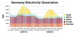- ^ "Electricity production from solar and wind in Germany in 2014 (German version)" (PDF). Germany: Fraunhofer Institute for Solar Energy Systems ISE. 5 January 2015. pp. 2, 3, 6. Retrieved 5 January 2015.