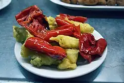 Soldaditos de Pavía (lit. “little soldiers of Pavia”) is a dish of fried cod wrapped in a slice of roasted red pepper. The dish is found in Andalusian cuisine and common at tapas bars in Madrid, capital of Spain. The cod is marinated in a paprika and lemon juice mix.[1] Before being fried, the pieces of cod can be placed in cold seasoned water and removed when the water begins to boil.[2] It's said to be a popular dish after Easter in the 1905 cookbook by Manuel Maria Puga y Parga.[3]