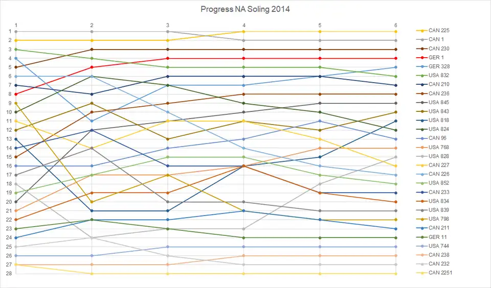 Rank Country Helmsman Crew Sail No. Race 1 Race 2 Race 3 Race 4 Race 5 Race 6 Total Total