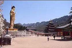 Beopjusa Temple grounds, with a golden statue of Buddha.