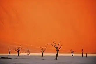 Deadvlei is another clay pan, about 2 km from Sossusvlei. A notable feature of Deadvlei is that it used to be an oasis with several camelthorn trees; afterwards, the river that watered the oasis changed its course. The pan is thus punctuated by blackened, dead camelthorn trees, in vivid contrast to the shiny white of the salty floor of the pan and the intense orange of the dunes. This creates a particularly fascinating and surrealistic landscape, that appears in innumerable pictures and has been used as a setting for films and videos.