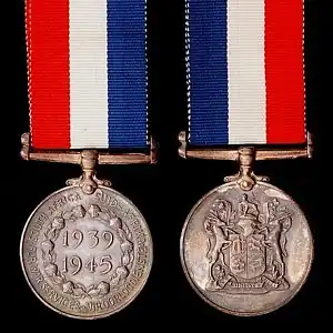 The South African Medal for War Services is a South African service medal for voluntary unpaid service in support of the war effort between 6 September 1939 and 15 February 1946, during the Second World War.[1][2][3][4][5]